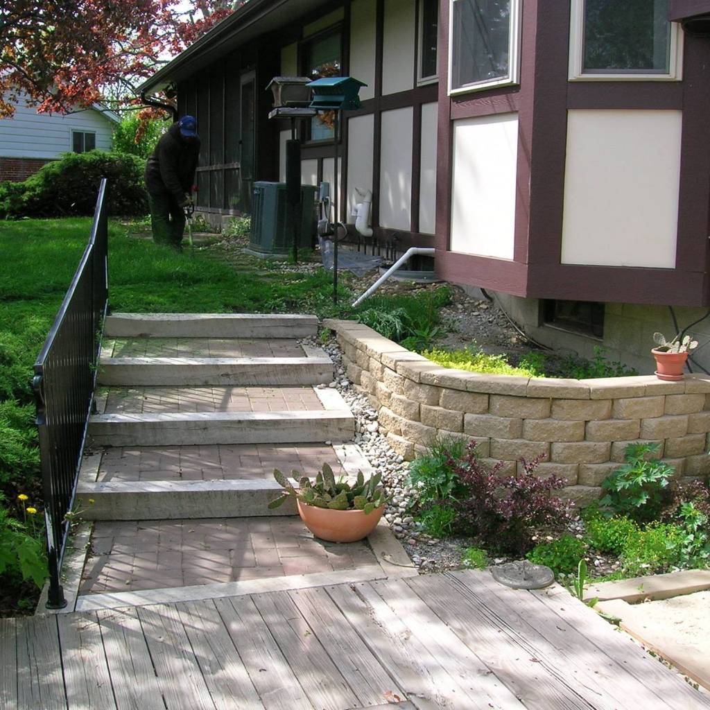 Outdoor staircase featuring pavers imbedded in landscape timbers; wrought aluminum railing; and small retaining wall.